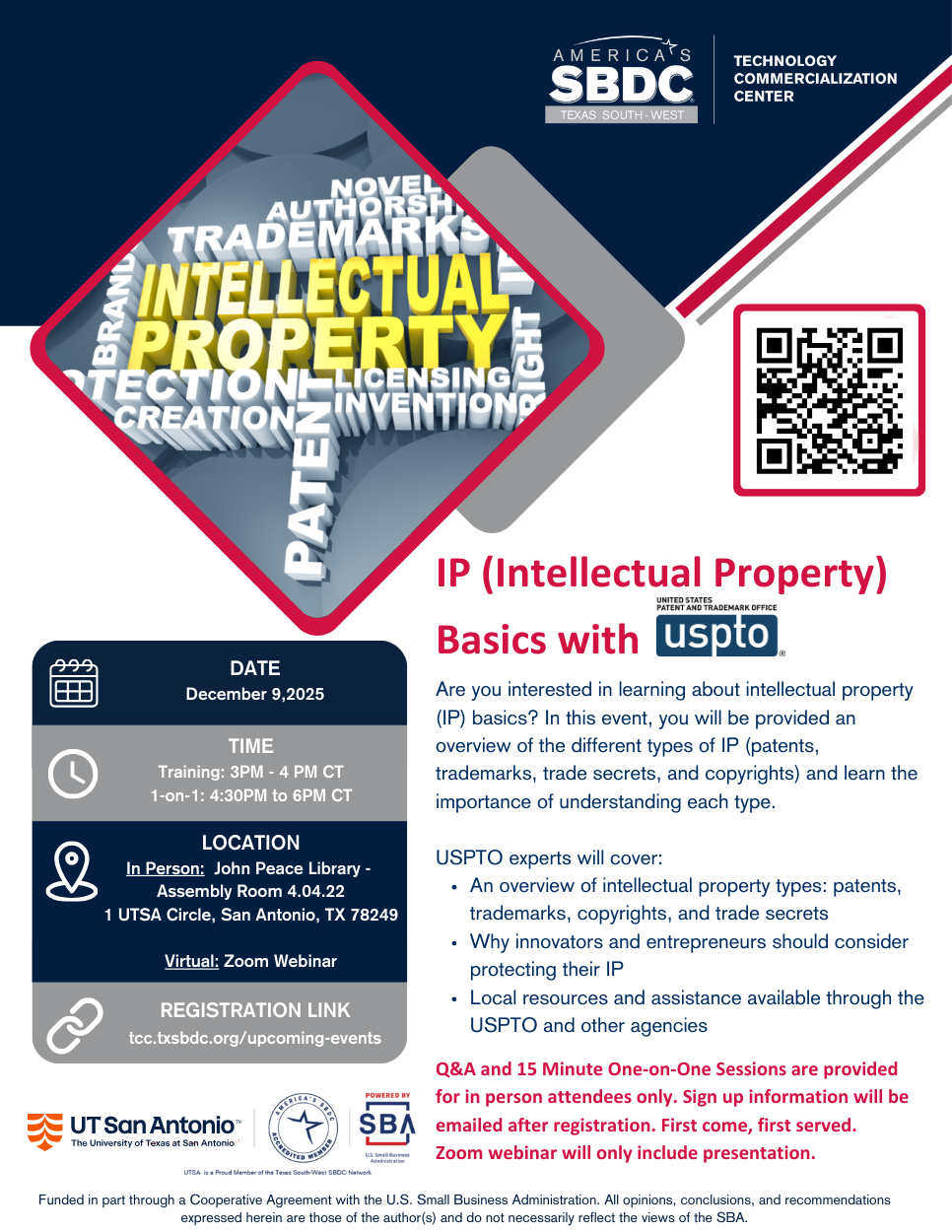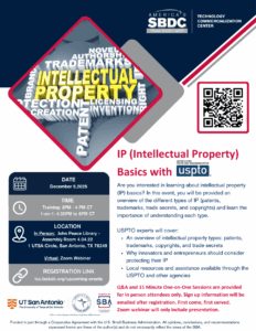 Are you interested in learning about intellectual property (IP) basics? In this event, you will be provided an overview of the different types of IP (patents, trademarks, trade secrets, and copyrights) and learn the importance of understanding each type.